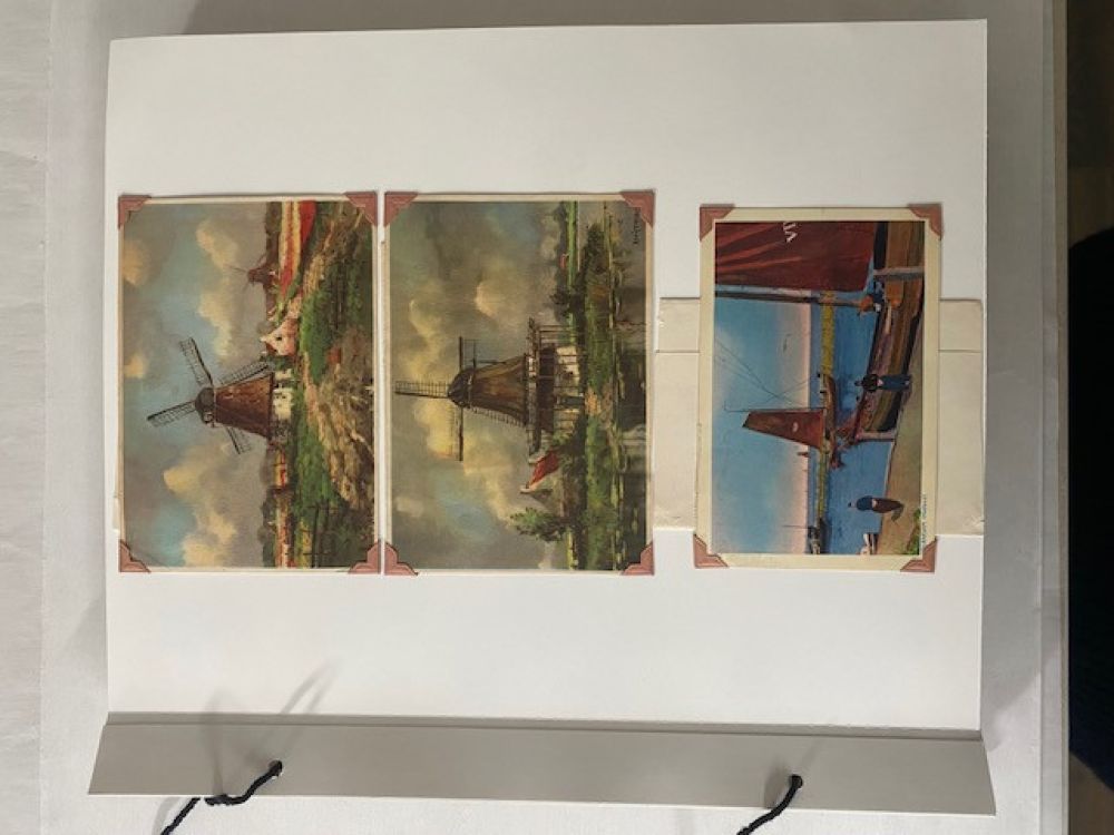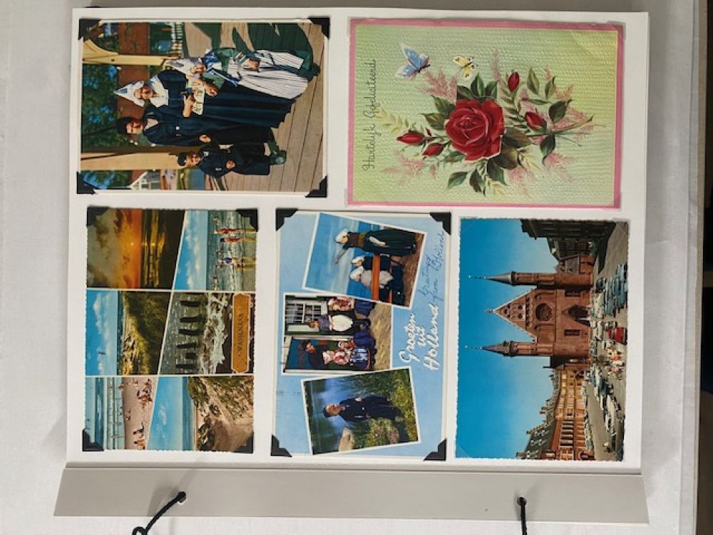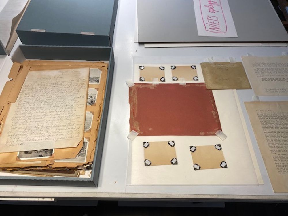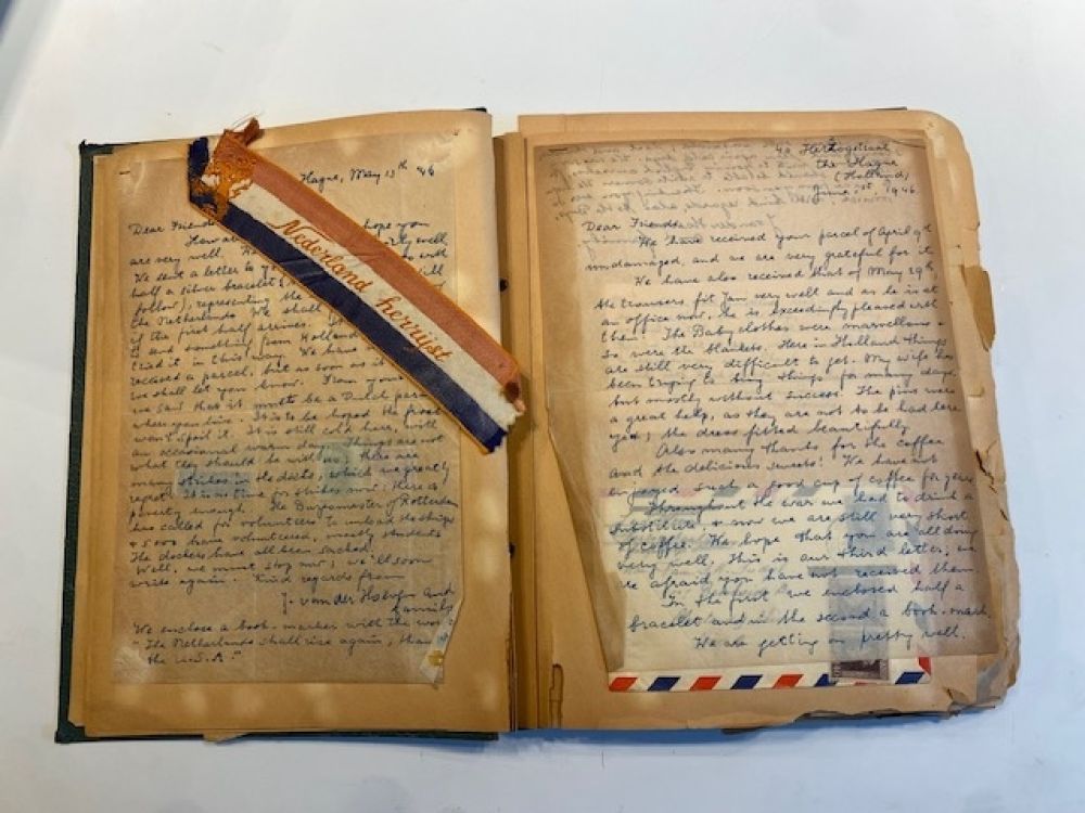 Een jas- een gift van een Amerikaanse familie aan een Nederlandse familie tijdens de hongerwinter- en een klein briefje met het adres van de gever in de jaszak- zo begon een uitvoerige correspondentie tussen een Amerikaanse en Nederlandse familie. De brieven, de ansichtkaarten en de foto’s, alles is zorgvuldig bewaard gebleven en in 2 scrap albums geplakt. De albumbladen waren helaas niet van een geweldige kwaliteit papier. Bij ieder raadpleging brokkelde het papier af. De vraag aan mij als restaurator was dan ook om alle documenten los te halen en in eenzelfde ordening op nieuwe zuurvrije bladen over te zetten. Een hele klus -met veel items op iedere kant van een blad, de broze brieven trapsgewijs- om deze zonder schade los te maken. Een mooie bijdrage als restaurator om een bijzondere familiegeschiedenis weer volledig toegankelijk te kunnen maken.